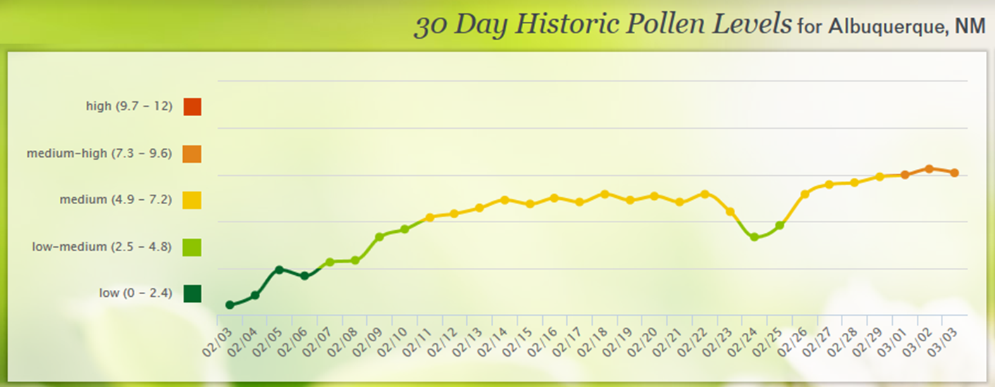 On the other hand, I’m right in the thick of a storm of pollen from other plants. Here the main offenders are trees like juniper, elm, cedar, and willow, with juniper pollen counts hitting particularly high levels in the last few weeks.