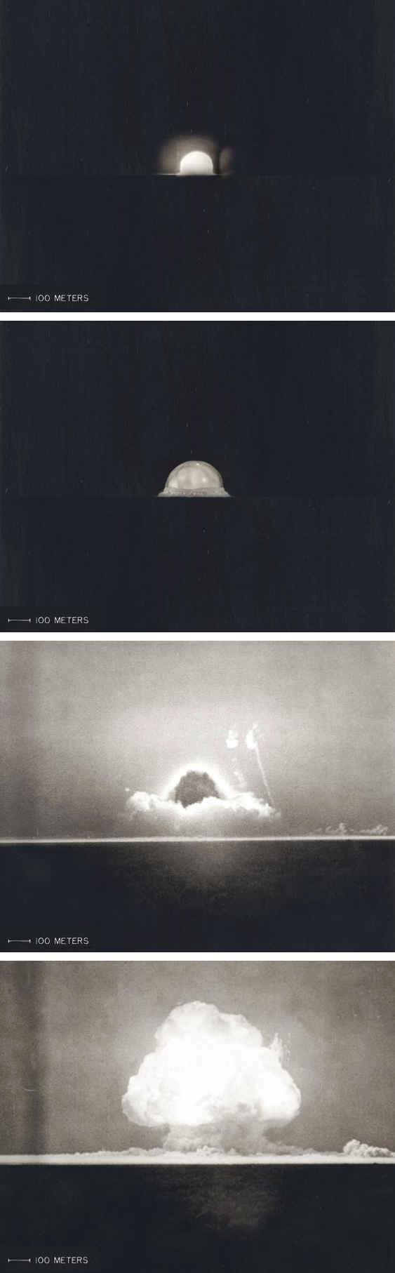 /Photos from the first nine seconds following the Trinity detonation, arranged to scale