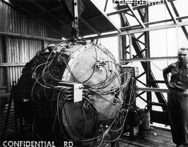 Taken together, the elaborate and meticulously-designed device was a large metal sphere nicknamed the Gadget. This was installed at the top of a 100-feet steel tower the night before detonation.